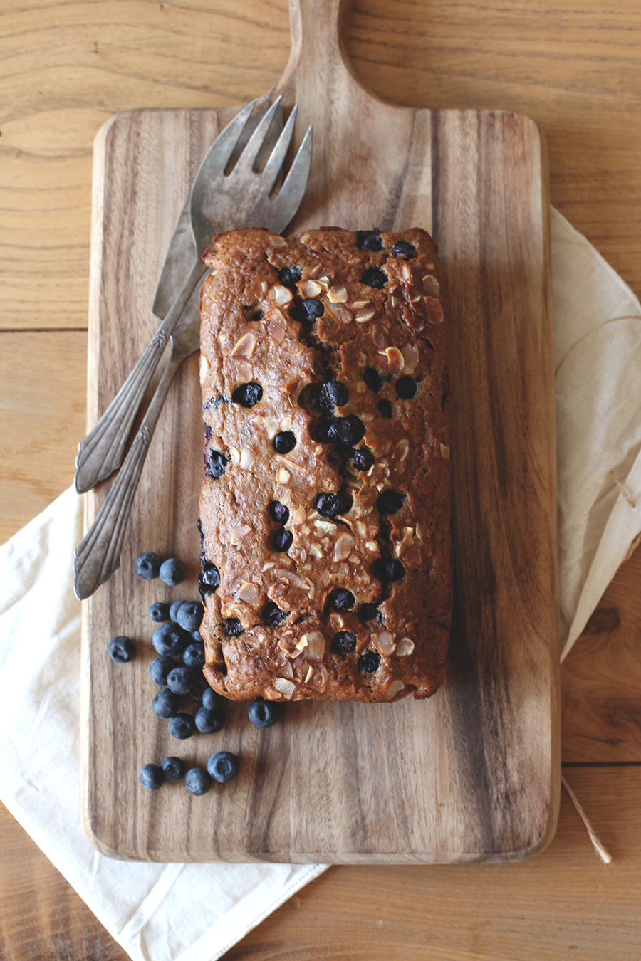Pour the batter into a non stick loaf pan and put blueberries on top with slivered almonds.