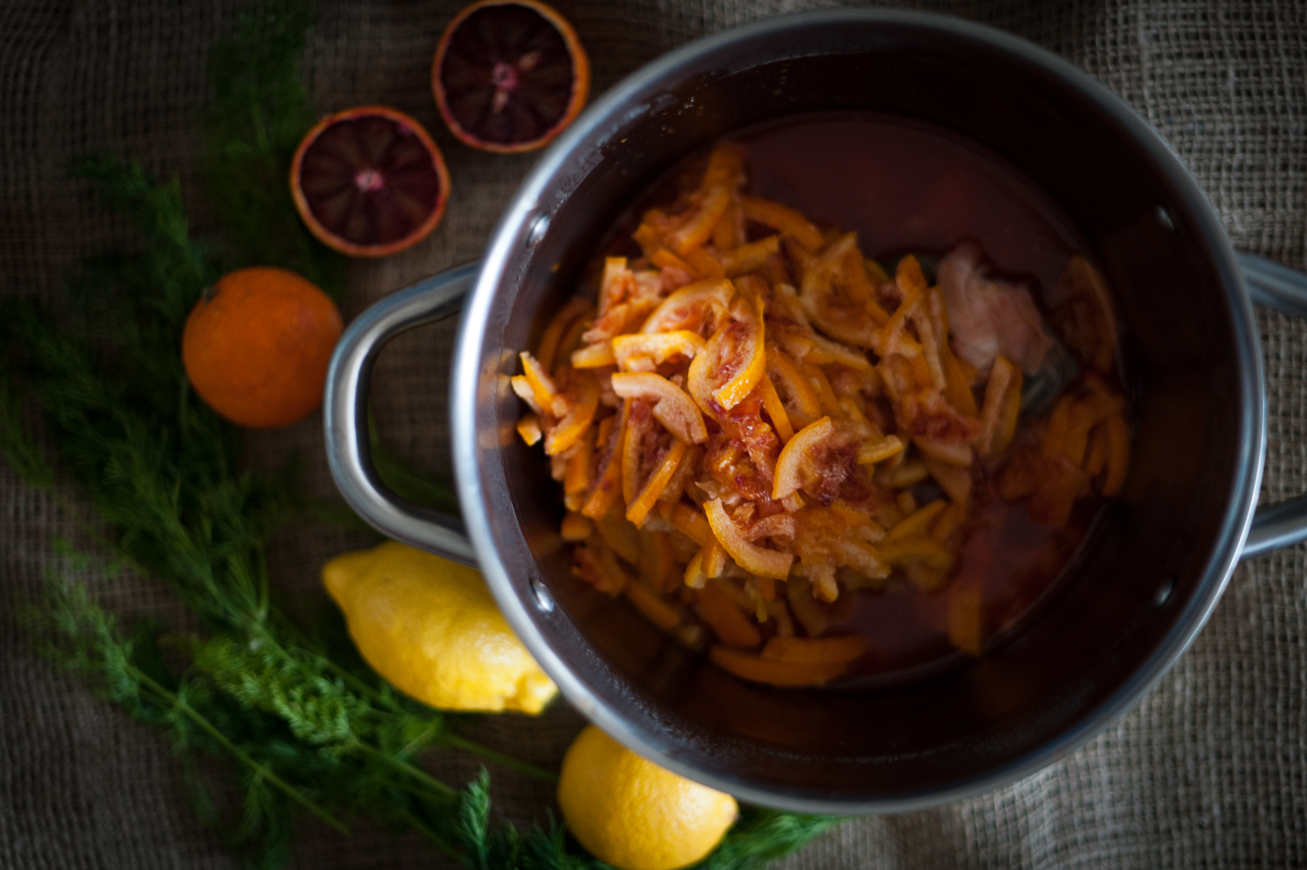 When done remove from the heat. Add the lemon juice to the pan. Make a bundle with the fennel fronds by securing them in the muslin. Add this to the boiled oranges and their liquid and leave it to soak overnight.
