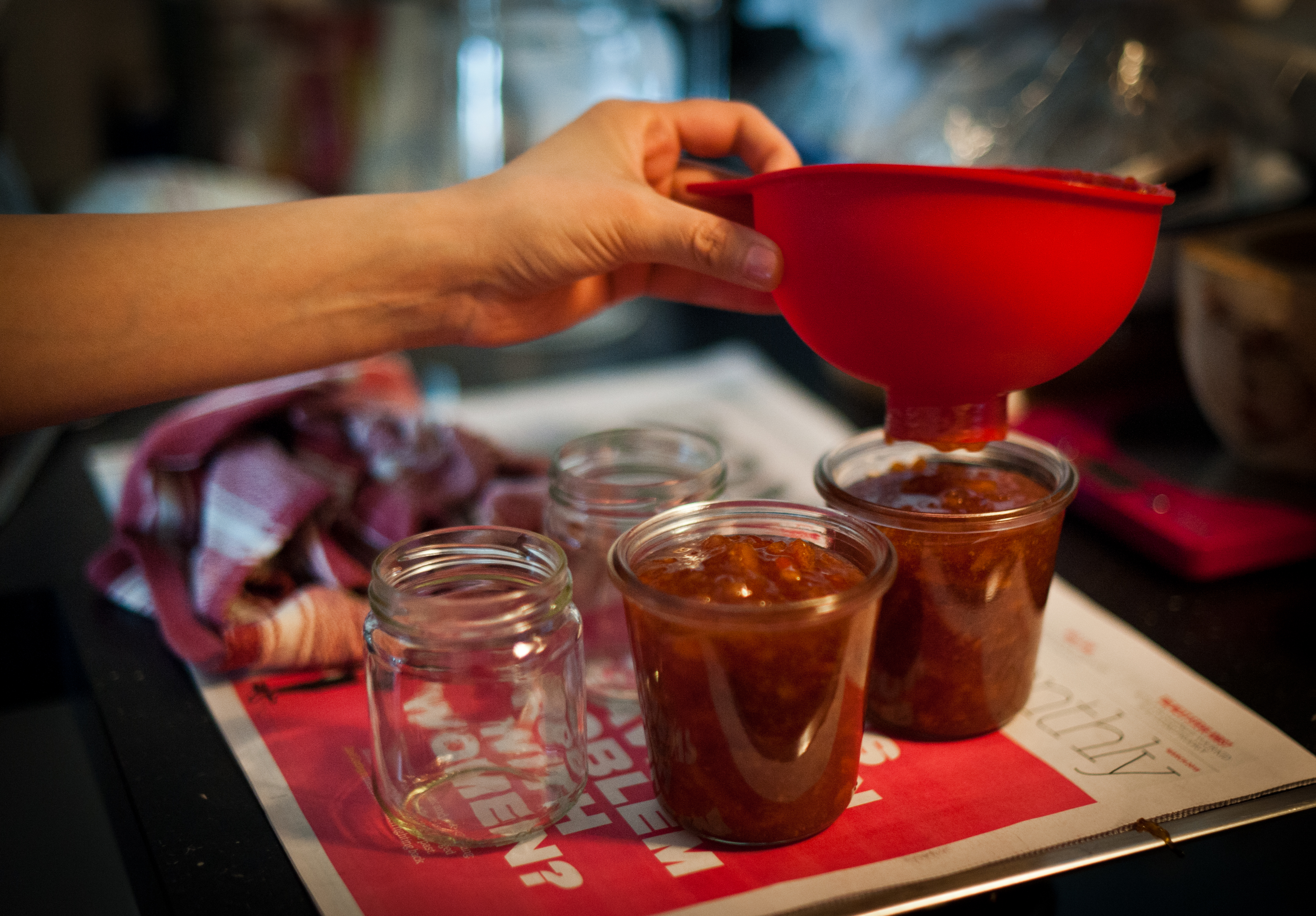 Let the marmalade cool for a several minutes. This allows the peel to disperse evenly. Ladle it into sterilised jars.