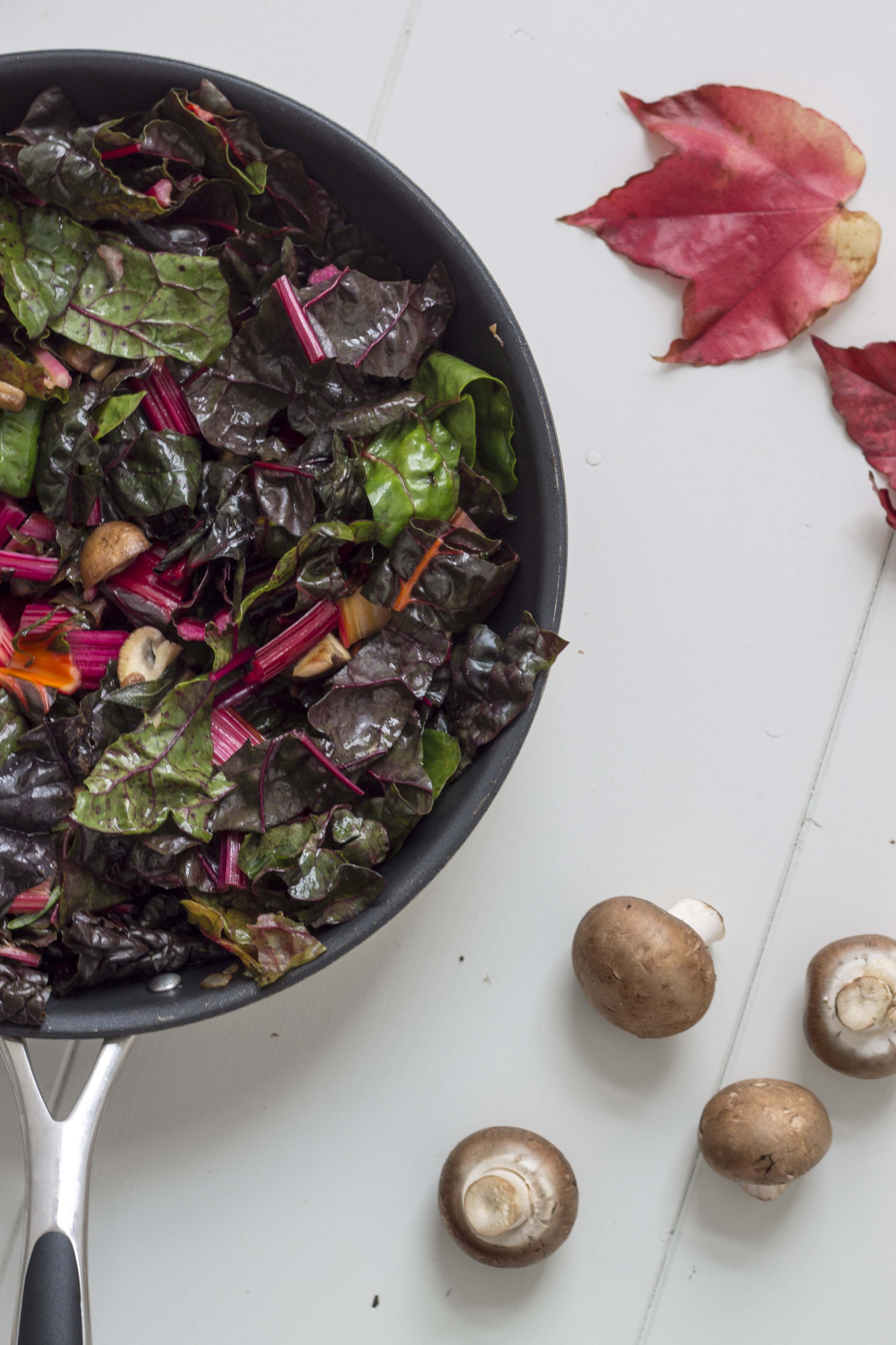 Heat oil in a large skillet over medium heat. Add onion and cook until translucent. Add mushrooms, rosemary and dukkah. Cook for about 5 minutes and add chard for about 3 minutes.