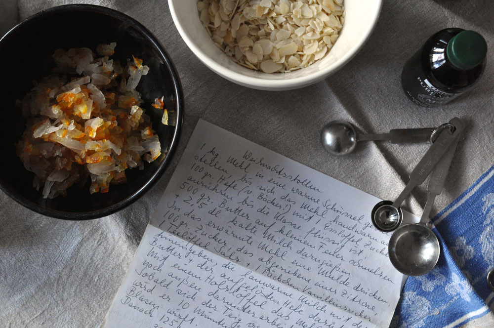 I may well skip the cookies, shun the roast, and barely get all the presents wrapped on time, but I never forget to make Stollen. Stollen is my sacred Christmas tradition. Because it is the best. Because it is hard work but not of the fiddly kind. And because every stroke that beats the dough closer to crumbly buttery perfection reminds me of my grandmother.