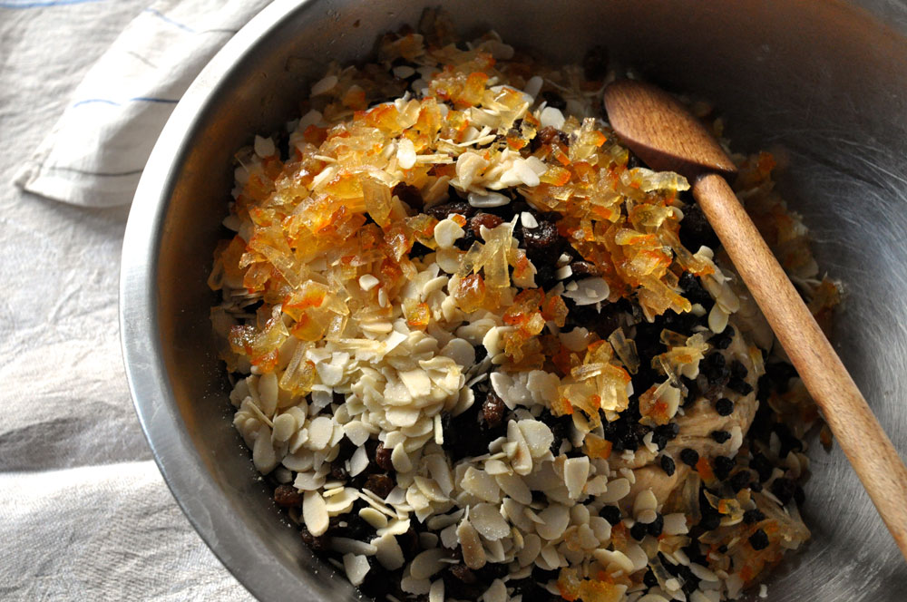 Knead the almonds, raisins, currants, and candied citrus into the dough. Shape into a ball, cover the bowl with a damp cloth, find a warm spot in the house and let rise until the dough has approximately doubled in size, 2 to 3 hours depending on the room temperature.