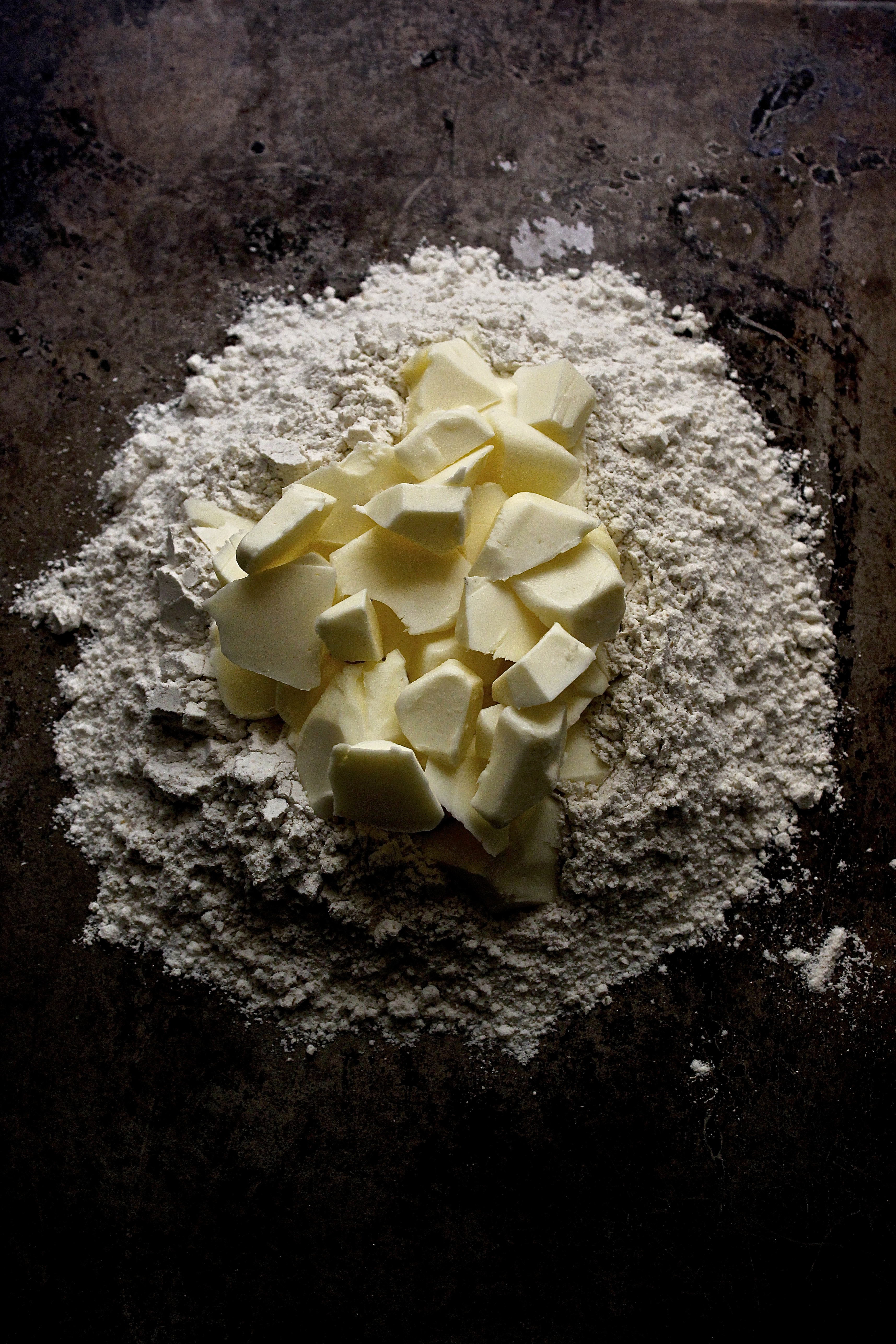 Start by making the pastry. In a bowl whisk together the all purpose flour, rye flour, salt and ground cardamom. Form a well in the middle and add the butter and egg yolk. Using a knife or a pastry cutter, cut the the butter into the flour until the mixture resembles sand. Using your hands quickly bring everything together – if the mixture appears crumbly and dry, add 1-2 teaspoons of cold water. Shape into a ball, wrap in cling film and place in the fridge for 30 minutes.
